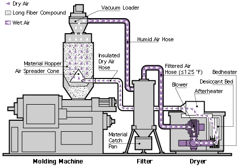 在料斗中,干燥单元通过封闭的空气循环系统通过塑料颗粒强制热除湿空气。通过筛剂干燥剂除去水分,筛选水分分子。然后将干燥空气加热到预设温度并递送到绝缘料斗中的材料。